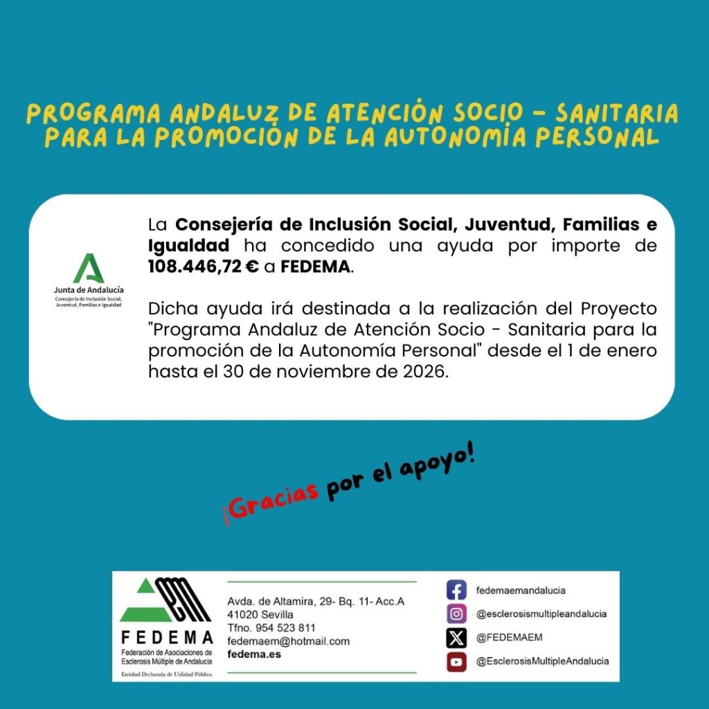 Dicha ayuda es destinada a la realización del Proyecto «Programa Andaluz de Atención Socio – Sanitaria para la promoción de la Autonomía Personal» desde el 1 de enero hasta el 30 de noviembre de 2026.